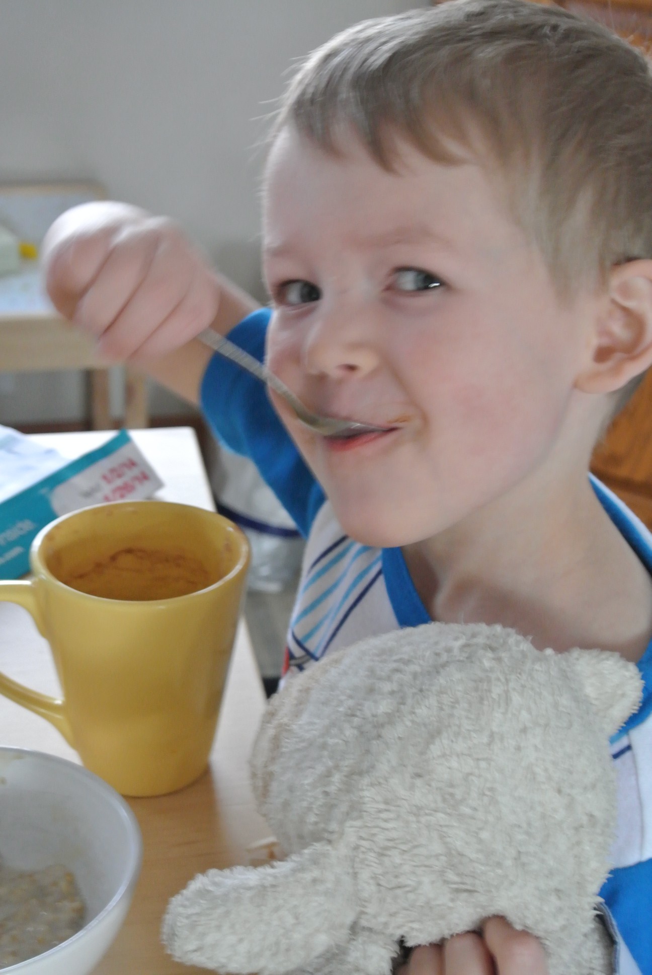 Hot chocolate and oatmeal for breakfast (with Lamby naturally)
