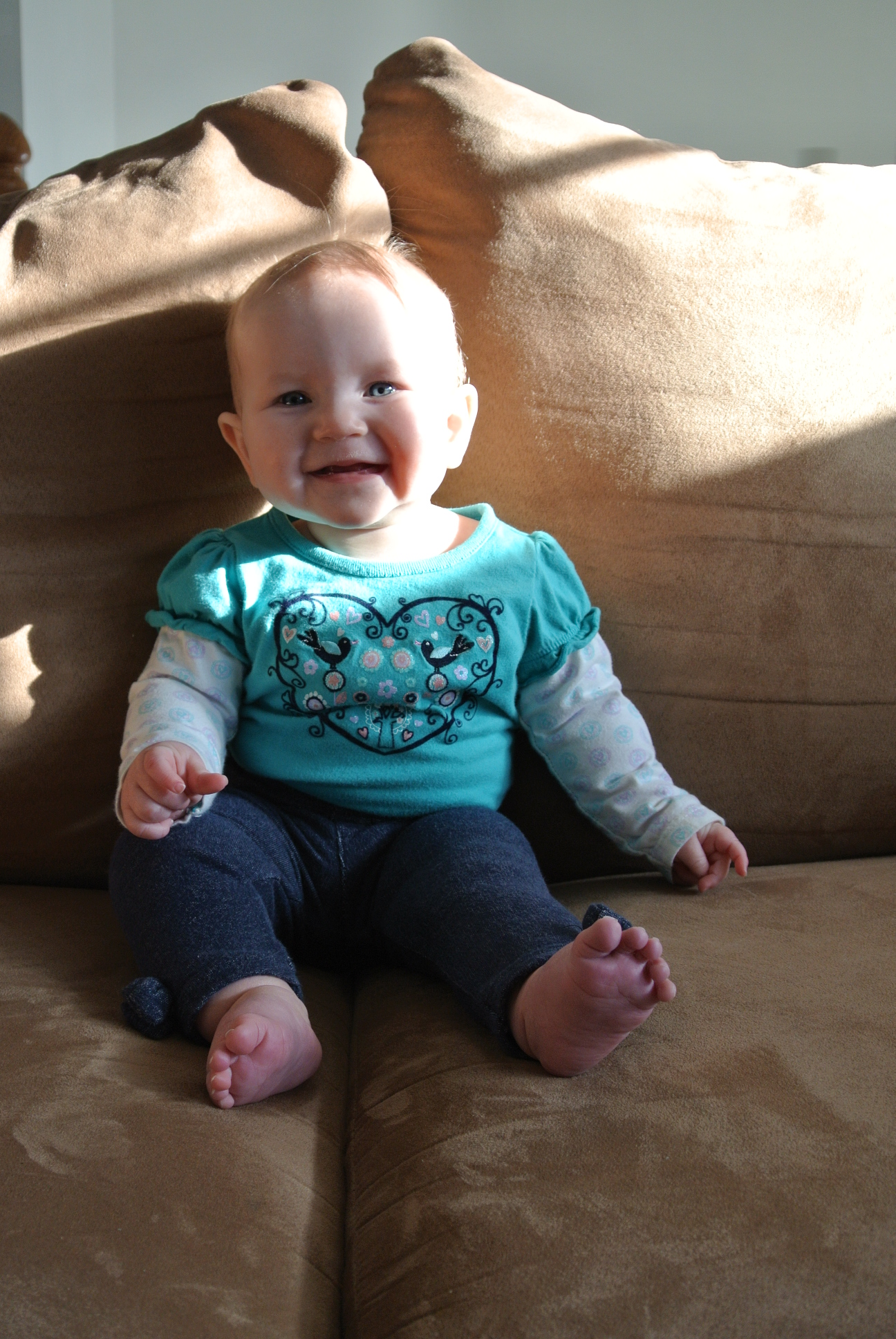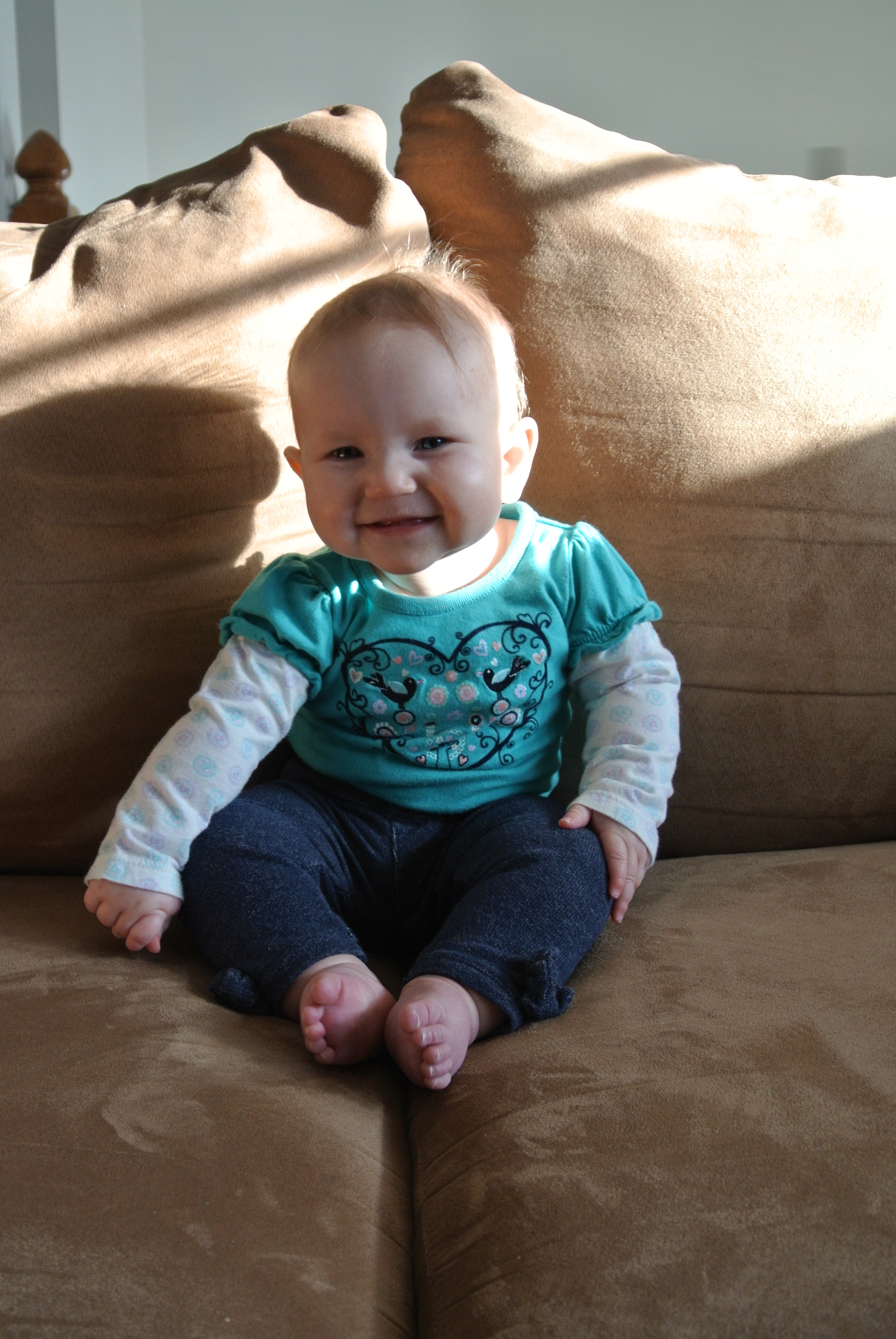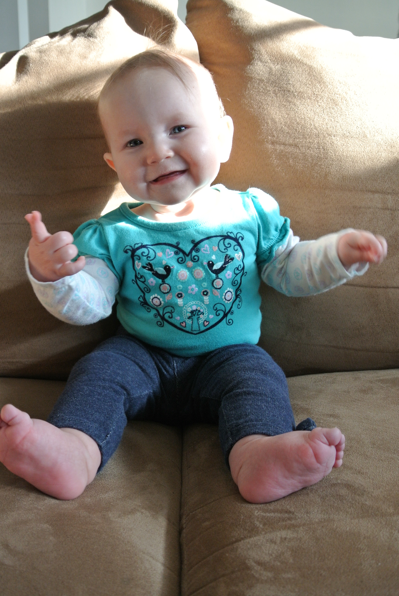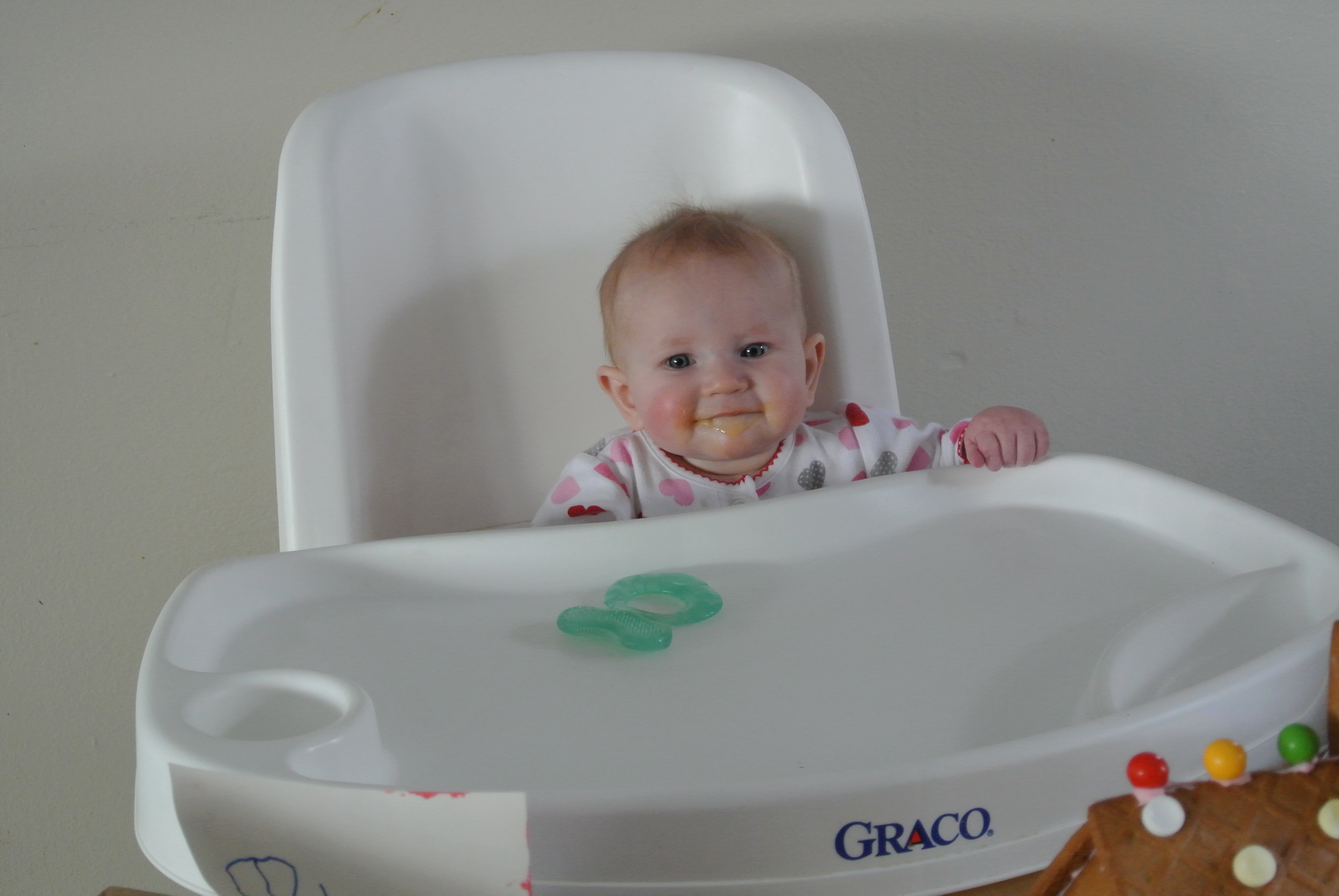 You sleep for 12 hours at night and take two naps during the day for about 1 hour and 30 minutes each. You’re getting stronger at sitting up on your own so you tried the high chair. You can barely see over the tray! We go back and forth between using the bumbo and high chair for meals.