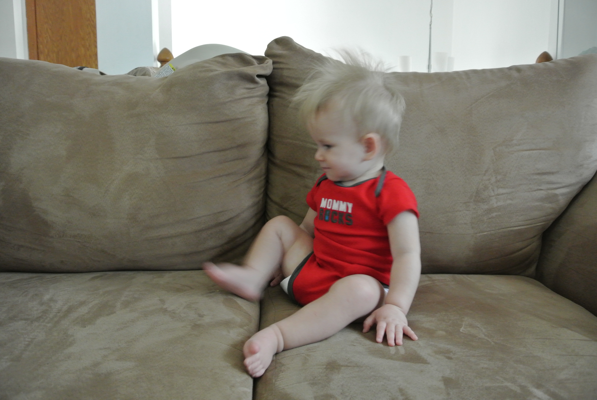 You have lots of hair and most of it sticks up. Nothing I do will make it stay down. I’ll put a bow in your hair and it is cute for all of 2 seconds until you pull it out. If I can distract you enough it’ll stay in longer. Your hair makes you look like a little, blonde rooster. It’s quite the mohawk.